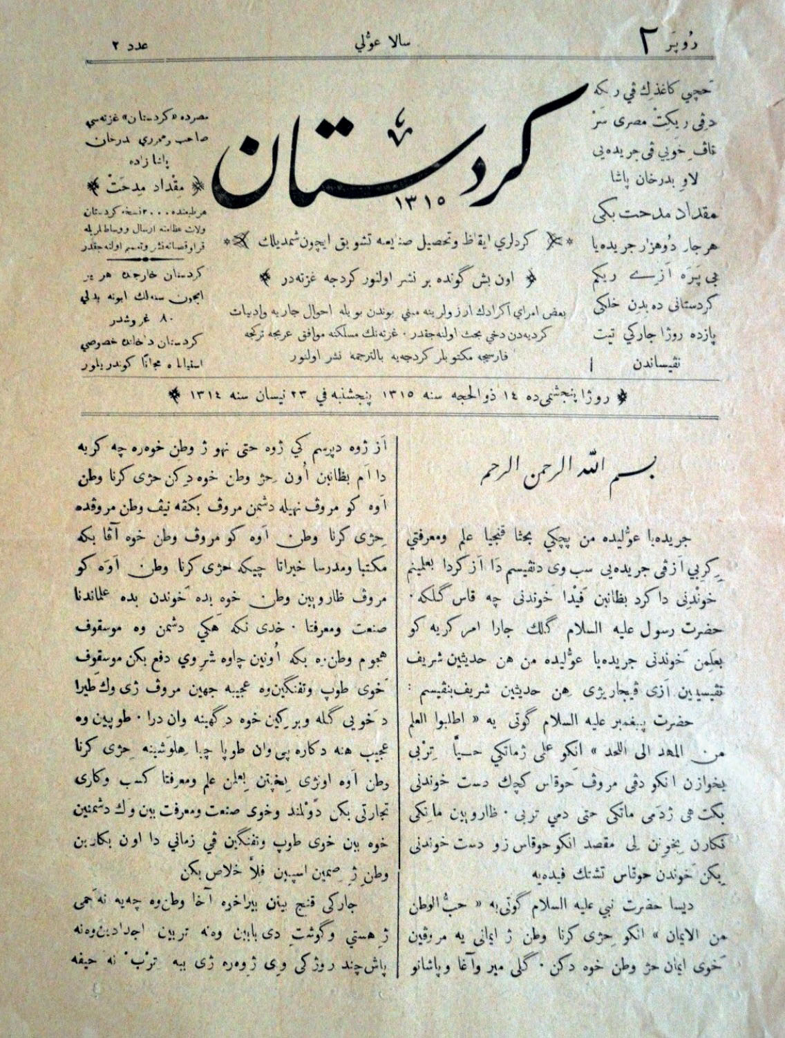 صدرت الصحيفة باللغة الكوردية باللهجة الكرمانجية مكتوبة بالحروف العربية وكانت تصدر مرتين شهريًا لتصل إلى 31 عددًا خلال أربع سنوات حتى عام 1902.