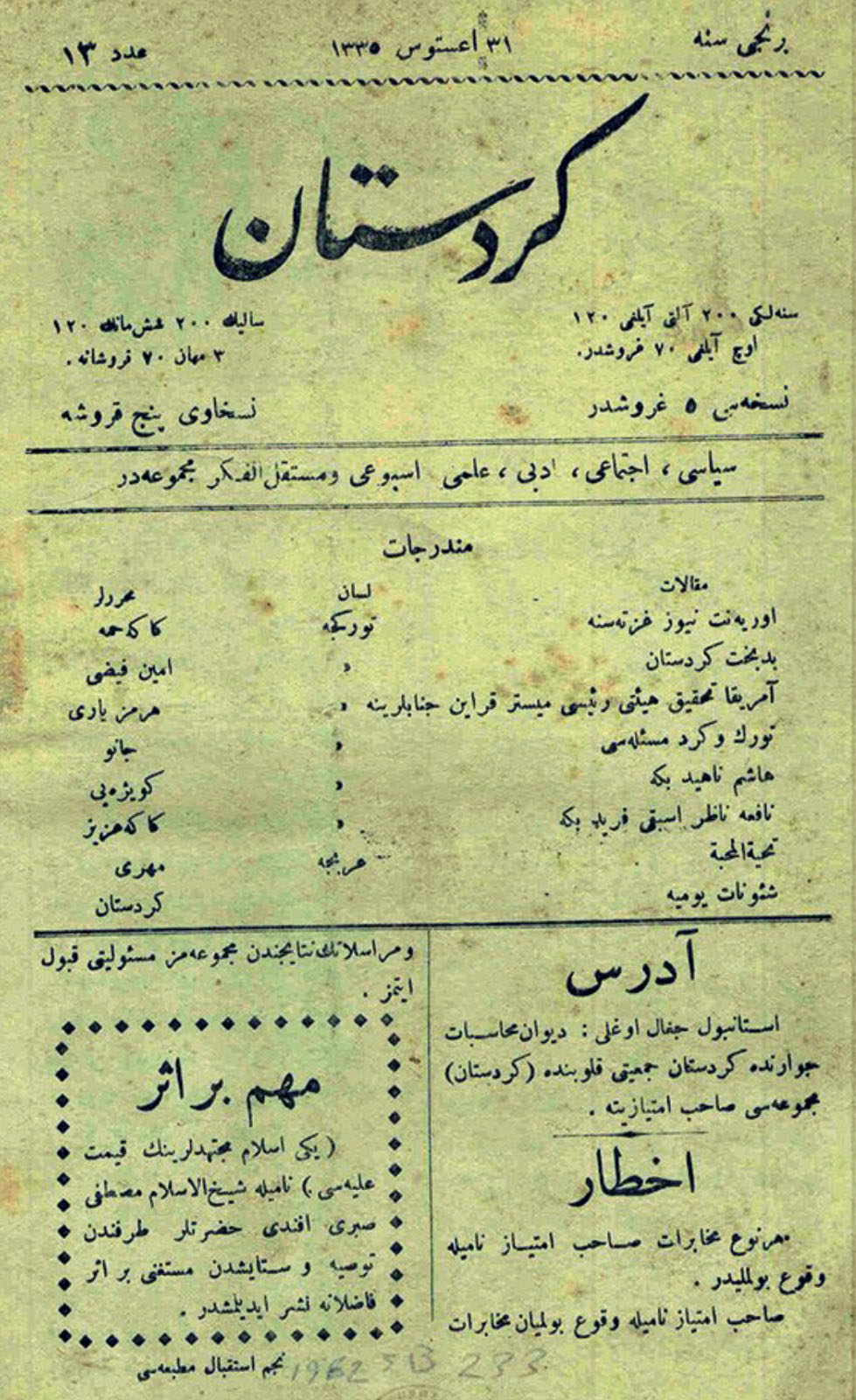 وظلت تلك الصحيفة منبرا للكتابات السياسية والأدبية والإجتماعية، وكتبت فيها سيدات كورديات، وعندما أدرك العثمانيون خطورتها حاربوا التجربة وأصدروا قرارات بغلقها ، بل ومعاقبة مؤسسها سليل العائلة البدرخانية ،الأمير مقداد مدحت بدرخان، تلك العائلة التي حكمت جزيرة بوطان.