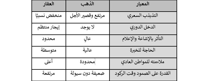 ولتوضيح الفارق العملي بين الاستثمار في الذهب والعقار ضمن السياق الإقليمي، يمكن تلخيص الصورة في المقارنة الآتية: