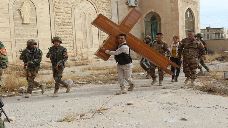 بالصور.. البيشمركة تعيد وضع الصليب فوق اكبر كنائس بعشيقة