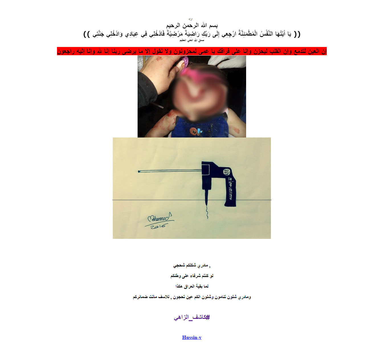 وترك الهاكر العراقي رسالة غاضبة على موقع وزارة الداخلية- تحت صورة طفلة يعتقد انها قتلت في التفجير- قال فيها  "للاسف ماتت ضمائركم".
