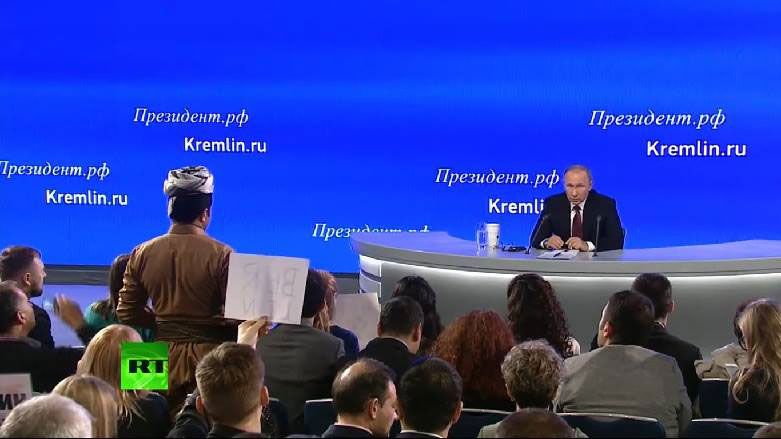 حديث بوتين جاء خلال مؤتمره الصحفي السنوي الكبير الذي عقد اليوم الجمعة في العاصمة موسكو بحضور عشرات الصحفيين المدعوين رسميا بينهم مدير مكتب كوردستان24 في روسيا خوشوي محمد الذي حضر إلى المؤتمر مرتديا الزي الكوردي.