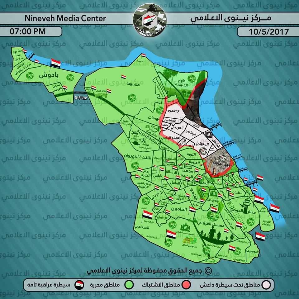 وقائد ضباط في الشرطة الاتحادية لكوردستان24 إن مسلحي داعش محاصرون في أحياء معدودة يقع فيها جامع النوري الكبير الذي ظهر به زعيم داعش لأول مرة عام 2014.