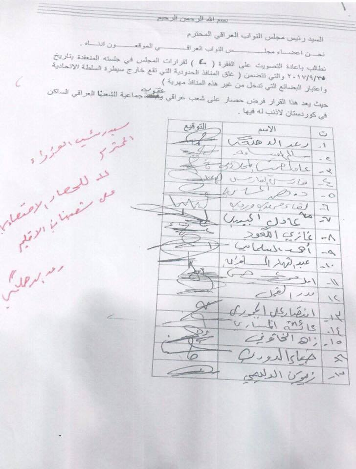 عارض نواب في البرلمان العراقي قرارات صادرة من مجلس النواب ضد اقليم كوردستان كرد على استفتاء اقليم كوردستان عن العراق، واصفين إياها بالعقاب الجماعي لشعب اقليم كوردستان.