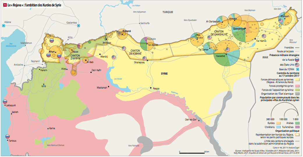 تكيّف الأكراد واللعبة الجيوسياسية الإقليمية، مع التحالف الأمريكي ضد "داعش" في شمال الفرات، ومع روسيا في منطقة عفرين على أمل لعب دور في محادثات السلام الجارية. ويدرك الكورد ان مجهودهم الحربي لن يكافأ بالضرورة من قبل الاوصياء الأميركيين والروس، وأن تركيا التي تعارض أي شكل من أشكال إشراك الاكراد في مفاوضات. ما من شأنه الاعتراف بإقليم "روجافا" ذو الحكم الذاتي في سياق سوريا الفدرالية. وهذه الغاية لم تنته بعد لدى الكورد، لذا يحاولون التقدم على الأرض. وتتمثل استراتيجيتهم في نشر مشروع الإدارة الذاتية على السكان المحليين على أساس المجالس المحلية المتداخلة (البلديات والمقاطعات والكانتونات). ليتحول في البداية التحالف المحلي العسكري بين الأكراد والعرب الى تحالف سياسي ايضاً في فيدرالية الشمال السوري، ما سيعطيهم المزيد من القوة للتفاوض مع دمشق، ومساحة زمنية أكبر للخروج من عزلتهم الاقليمية. فضلاً عن رغبة الكورد في إزالة أي شبهة بشأن مشروعهم الذي يُنظر إليه على أنه عرقي بحت.