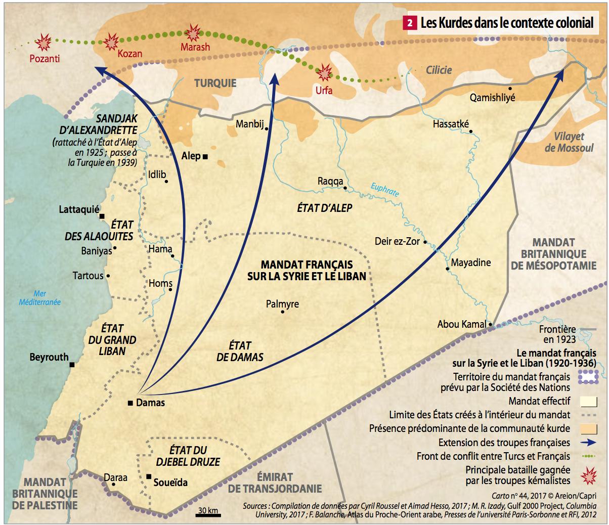 سنة 1916، وفي أعقاب المفاوضات السرية لاتفاقية "سايكس بيكو" بين فرنسا والمملكة المتحدة، حصل الفرنسيون على منطقة من البحر المتوسط إلى الحدود الفارسية، والتي شملت سوريا، ومنطقة الموصل، وجزء كبير من شمال كردستان، والتي كان يطلق عليها اسم "المنطقة الشرقية". حيث أصبحت معظم المناطق الكردية في الشمال والغرب (حاليا في تركيا وسوريا) داخل منطقة النفوذ الفرنسية - التي تديرها مع كيليكيا. في حين أن المناطق الكردية في الجنوب (كردستان العراق) أصبحت منطقة تابعة للنفوذ البريطاني. رافق هذه الحقبة مذبحة الأرمن (1915-1916) وترحيلهم إلى سوريا ولبنان، ما أدى الى إحداث تغير ديموغرافي في العديد من مناطق شرق الأناضول.
