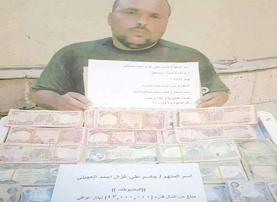 وألقى عناصر الأمن القبض على العجيلي، وبعد البحث والتحري في داره عثر على مبلغ مالي مقداره ( ٤٣ ) مليون دينار مخبأة داخل إناء حليب فارغ من الحليب محكم الإغلاق مدفون تحت الأرض، في قرية الجماسة منطقة بادوش غرب مدينة الموصل.