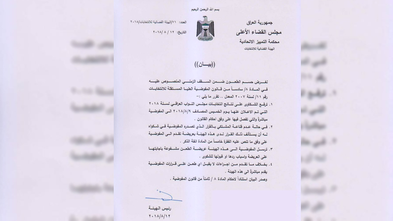 وقال القضاء العراقي في بيان إنه لغرض حسم الطعون ضمن السقف الزمني المحدد في قانون مفوضية الانتخابات المُقر عام 2007 فقد تقرر أن تُرفع الشكاوى على النتائج الى المفوضية مباشرة.