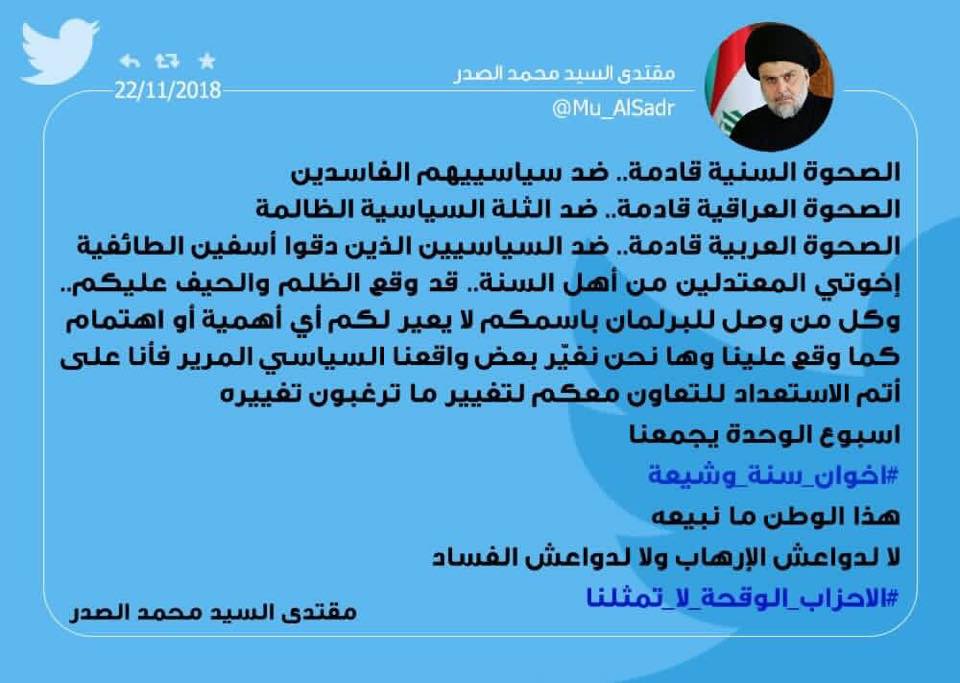 وكتب الصدر على حسابه في موقع تويتر في جزء من حديثه ان "الصحوة السنية قادمة ضد سياسييهم الفاسدين...".