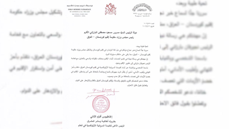 جاء ذلك في رسالة تهنئة وجهها بطريرك الكنيسة السريانية الأرثوذكسية إغناطيوس أفرام الثاني، الى مسرور بارزاني بعد تسنمه رئاسة الحكومة.