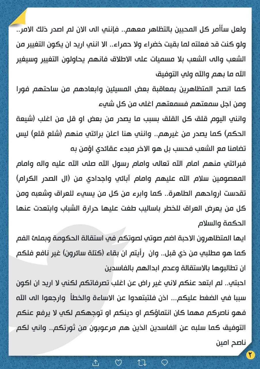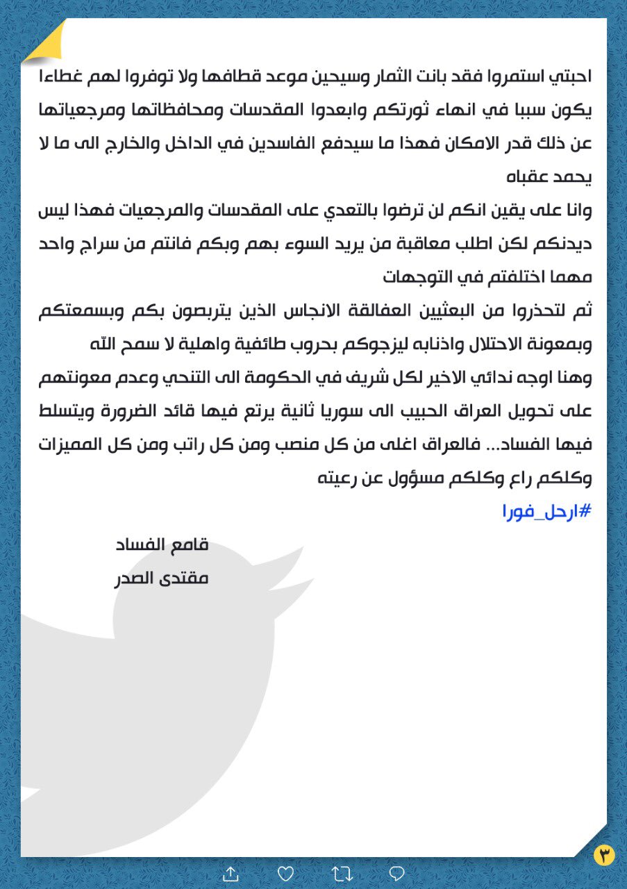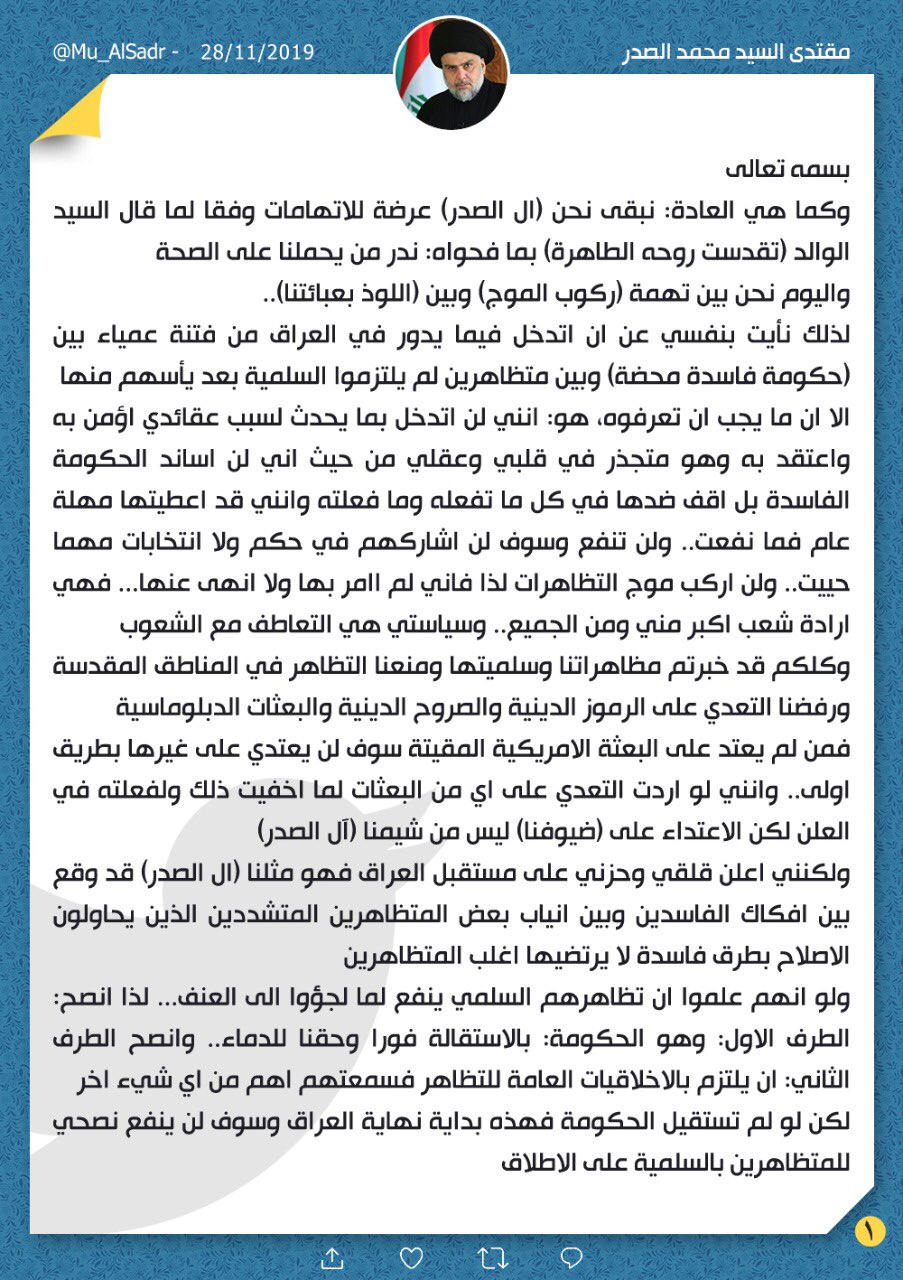 وكتب الصدر على حسابه في موقع تويتر "نداء لكل شريف في الحكومة إلى التنحي وعدم المساعدة في تحويل العراق إلى سوريا ثانية يرتع فيها قائد ضرورة ويتسلط فيها الفساد".