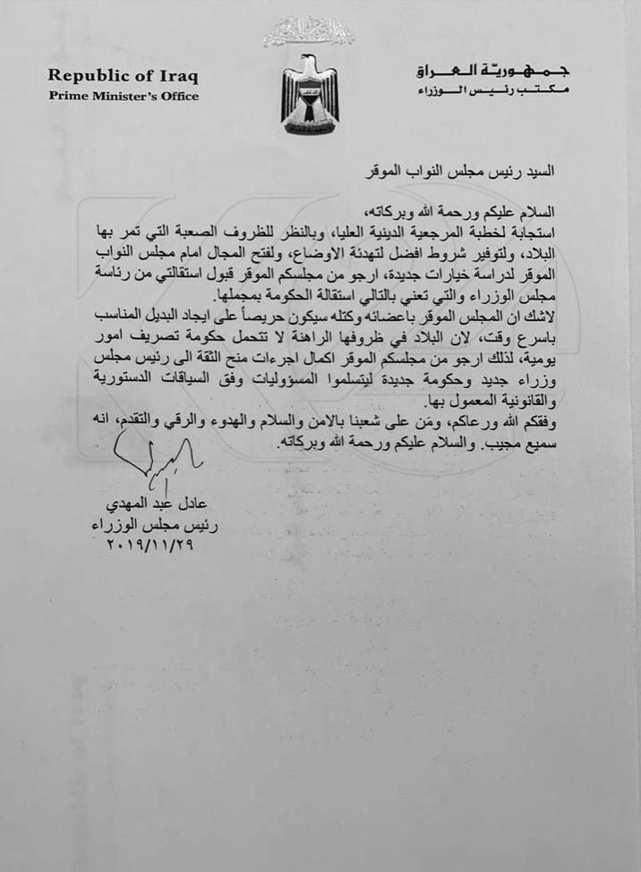 وقرأ عبد المهدي نص الاستقالة خلال جلسة مجلس الوزراء يوم أمس وبعدها أرسلها الى البرلمان للمصادقة عليها بحسب القانون.