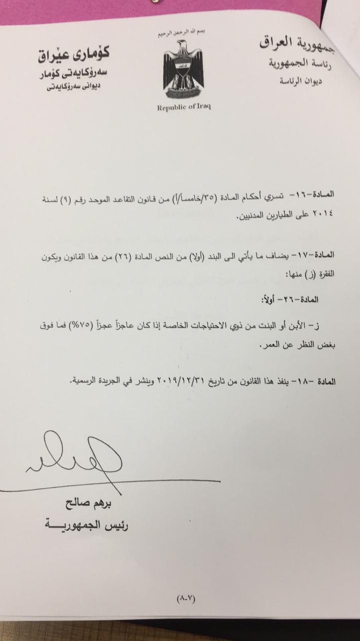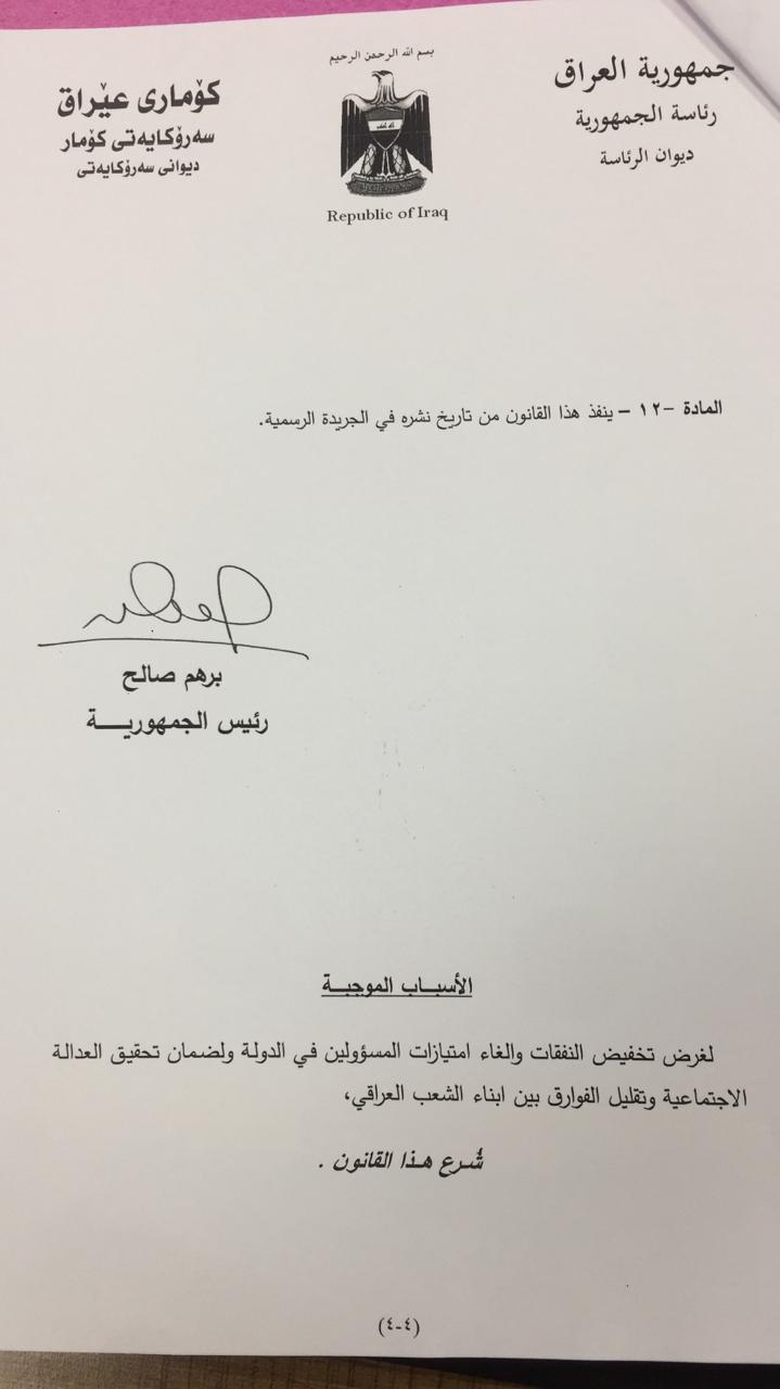 صدّق الرئيس العراقي برهم صالح على قانون التقاعد الموحد الجديد وإلغاء الامتيازات المالية لكبار المسؤولين في البلاد.