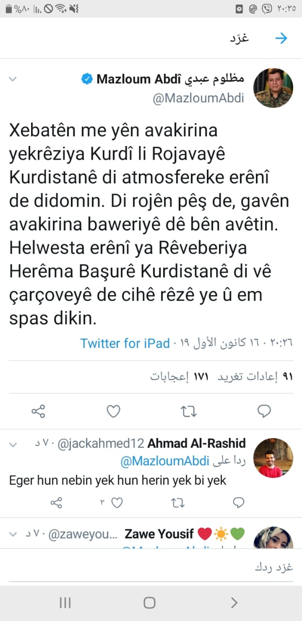 ونشر كوباني على حسابه في موقع تويتر "نتائج جهودنا من اجل وحدة الموقف الكوردي ايجابية، وفي الايام المقبلة ستكون هناك خطوات لبناء الثقة وفي هذا الصدد نشكر ونقدر عاليا الموقف الايجابي لاقليم كوردستان".