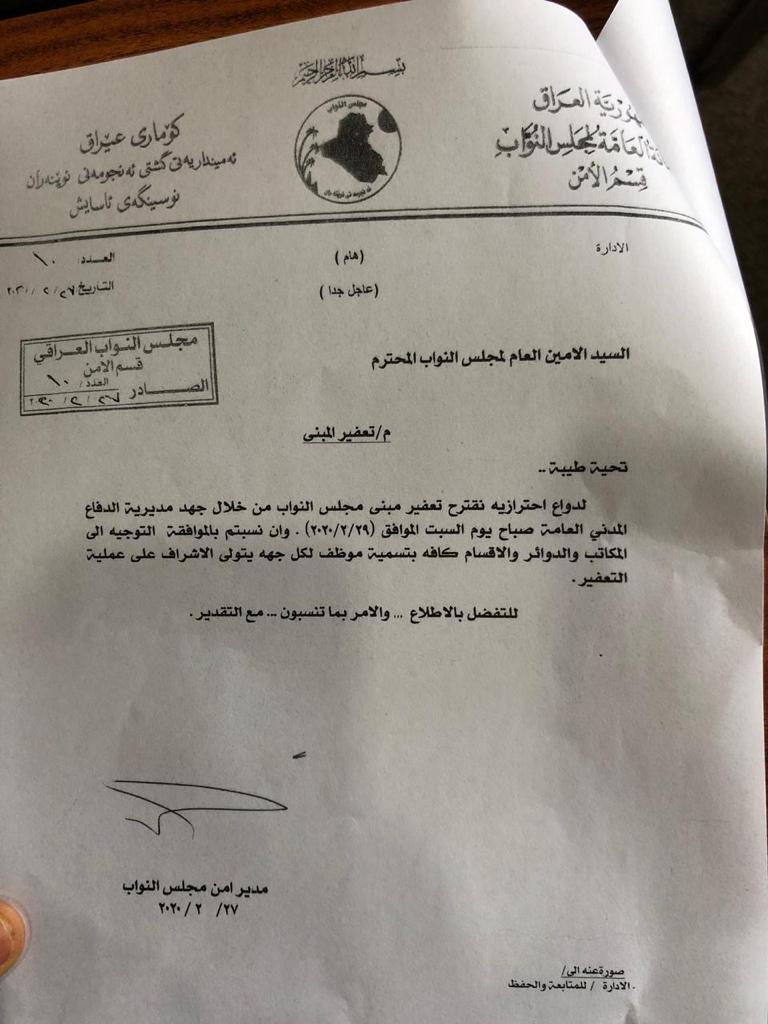 أرسل مدير أمن البرلمان العراقي مقترحاً "عاجلاً جداً" لتعقيم مبنى البرلمان في إطار الإجراءات الوقائية لمواجهة فيروس كورنا.