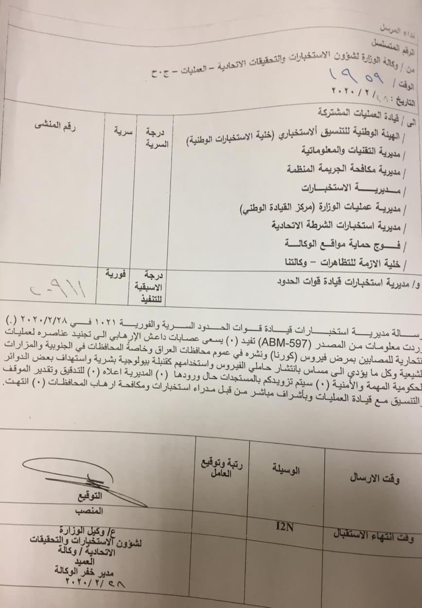 وذكرت الوثيقة الموجهة الى قيادة العمليات المشتركة أن "تنظيم داعش يسعى لتجنيد عناصره للقيام بعمليات انتحارية للمصابين بفيروس كورونا ونشره في عموم العراق وخاصة المحافظات الجنوبية والمزارات الشيعية وكل ما يؤدي الى مساس بانتشار حاملي الفيروس واستخدامهم كقنبلة بيولوجية بشرية".
