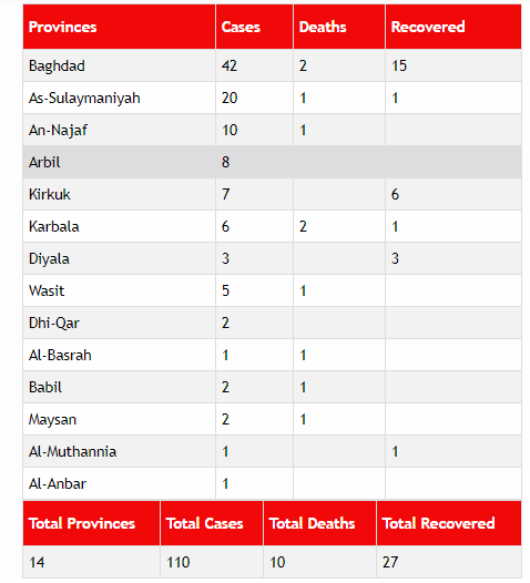 أربيل (كوردستان 24)- أعلنت وزارة الصحة العراقية السبت تسجيل خمس إصابات جديدة بفيروس كورونا ما يرفع العدد الكلي للمصابين الى 110 إصابات بينها 10 وفيات.