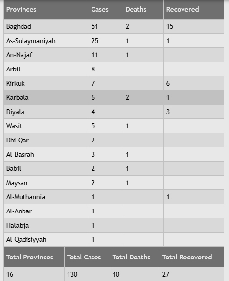وبهذا يرتفع عدد الإصابات في عموم العراق الى 130 إصابة بضمنها 10 وفيات فضلاً عن 27 حالة تماثلت للشفاء وغادرت المستشفيات.