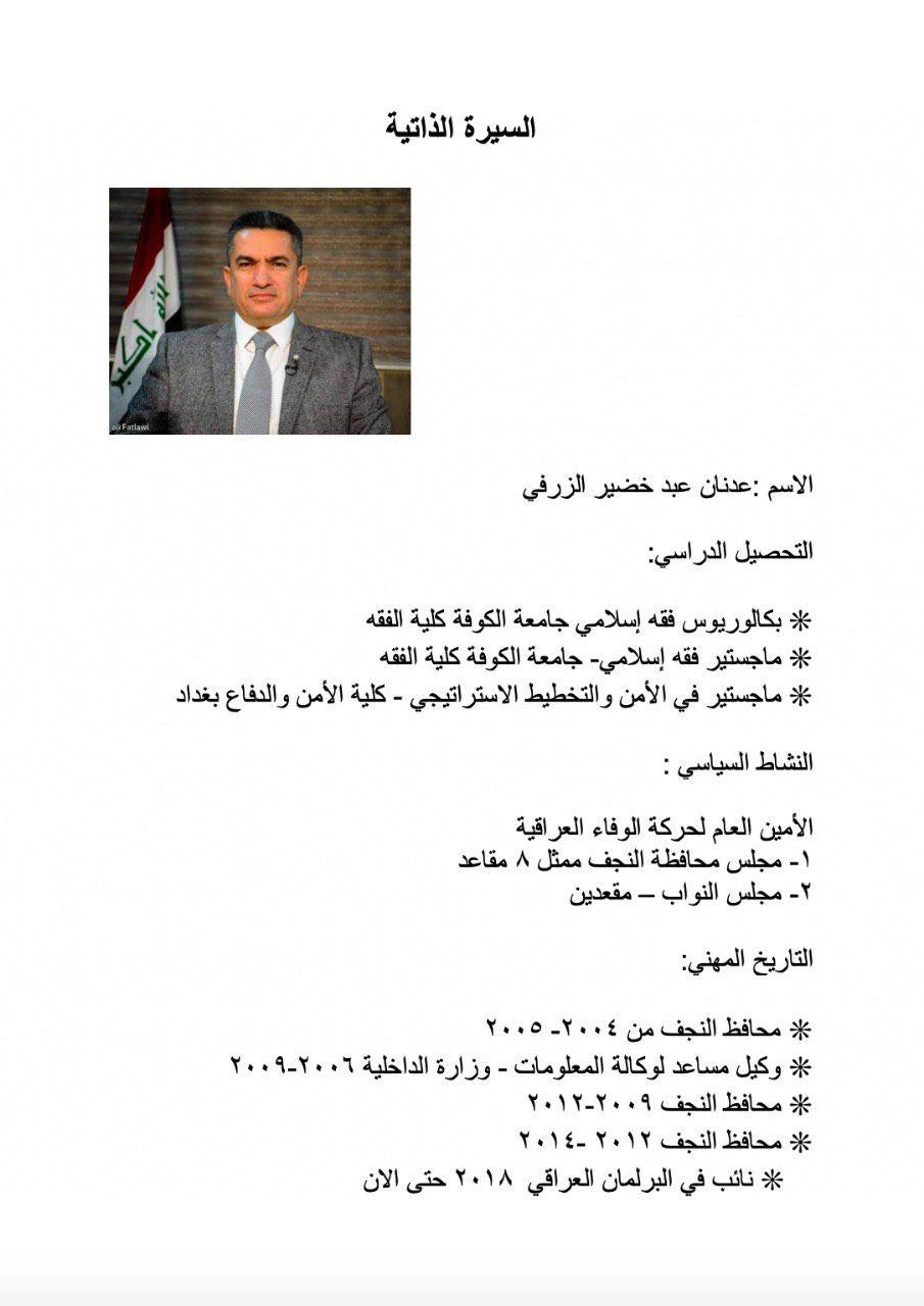 وهذه السيرة الذاتية للزرفي الذي يقود كتلة النصر في البرلمان العراقي تحت مظلة ائتلاف النصر الذي يقوده رئيس الوزراء السابق حيدر العبادي.