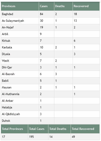 كما أعلنت السلطات الصحية في ذي قار، وهي المحافظة المجاورة للبصرة، تسجيل اول وفاة لمصاب بفيروس كورونا المعروف باسم كوفيد-19.