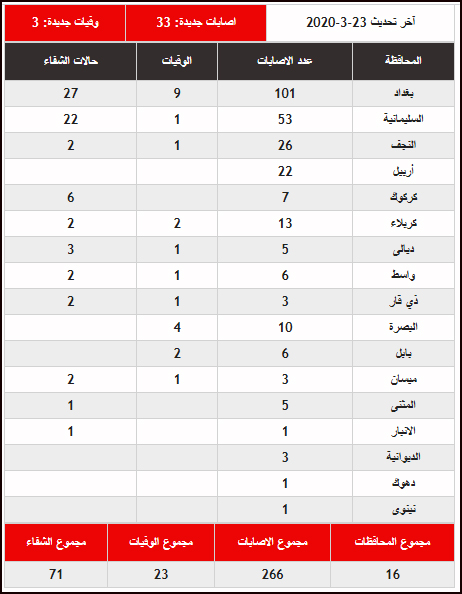 وقالت وزارة الصحة إنها سجلت ثلاث وفيات في بغداد والبصرة وديالى ما يرفع عدد الوفيات في عموم العراق الى 23 حالة وفاة.