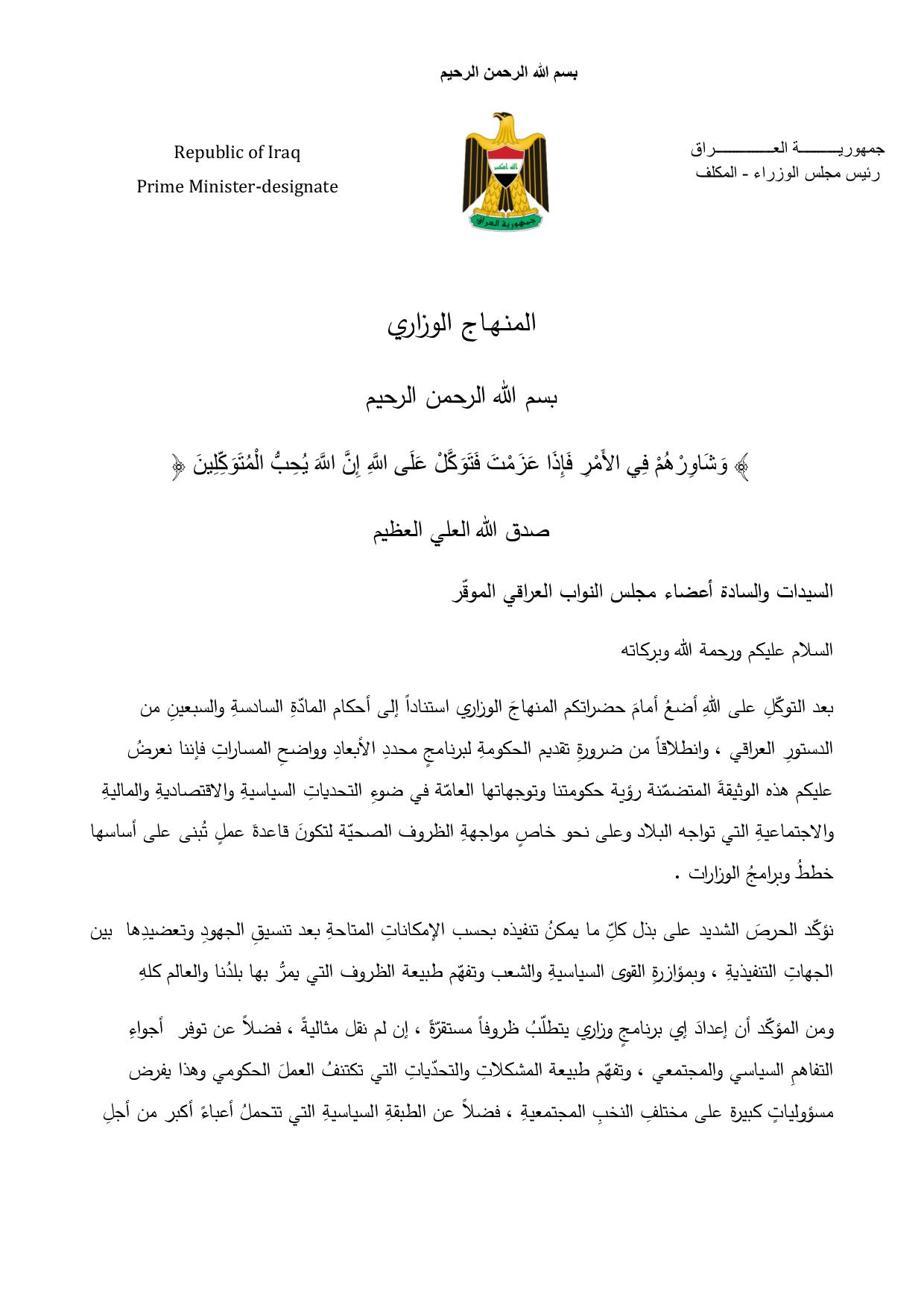 الزرفي يعلن برنامجه الوزاري ويحدد طبيعة العلاقة مع كوردستان