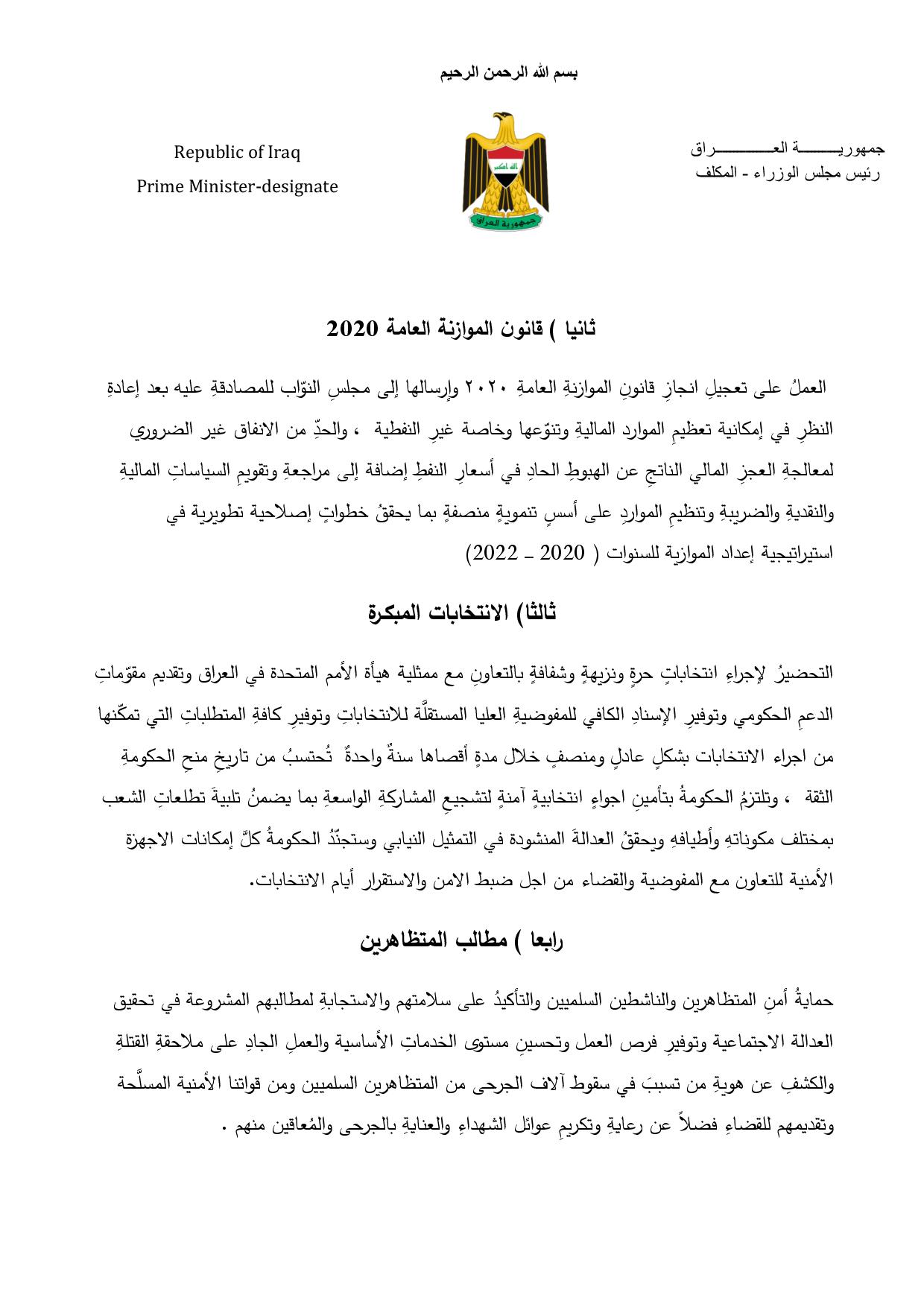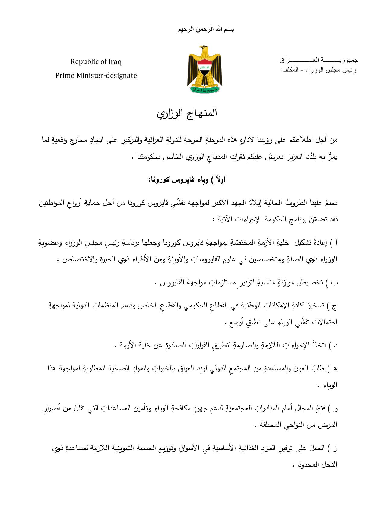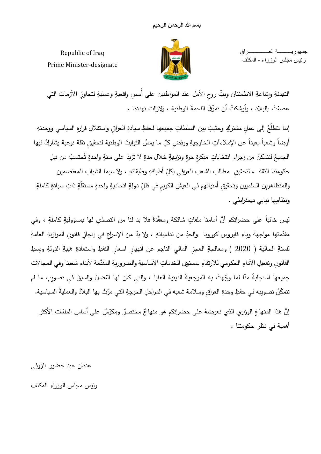 أعلن رئيس الوزراء العراقي المكلف عدنان الزرفي عن برنامج عمله الوزاري إذا ما تم انتخابه تحت قبة البرلمان.