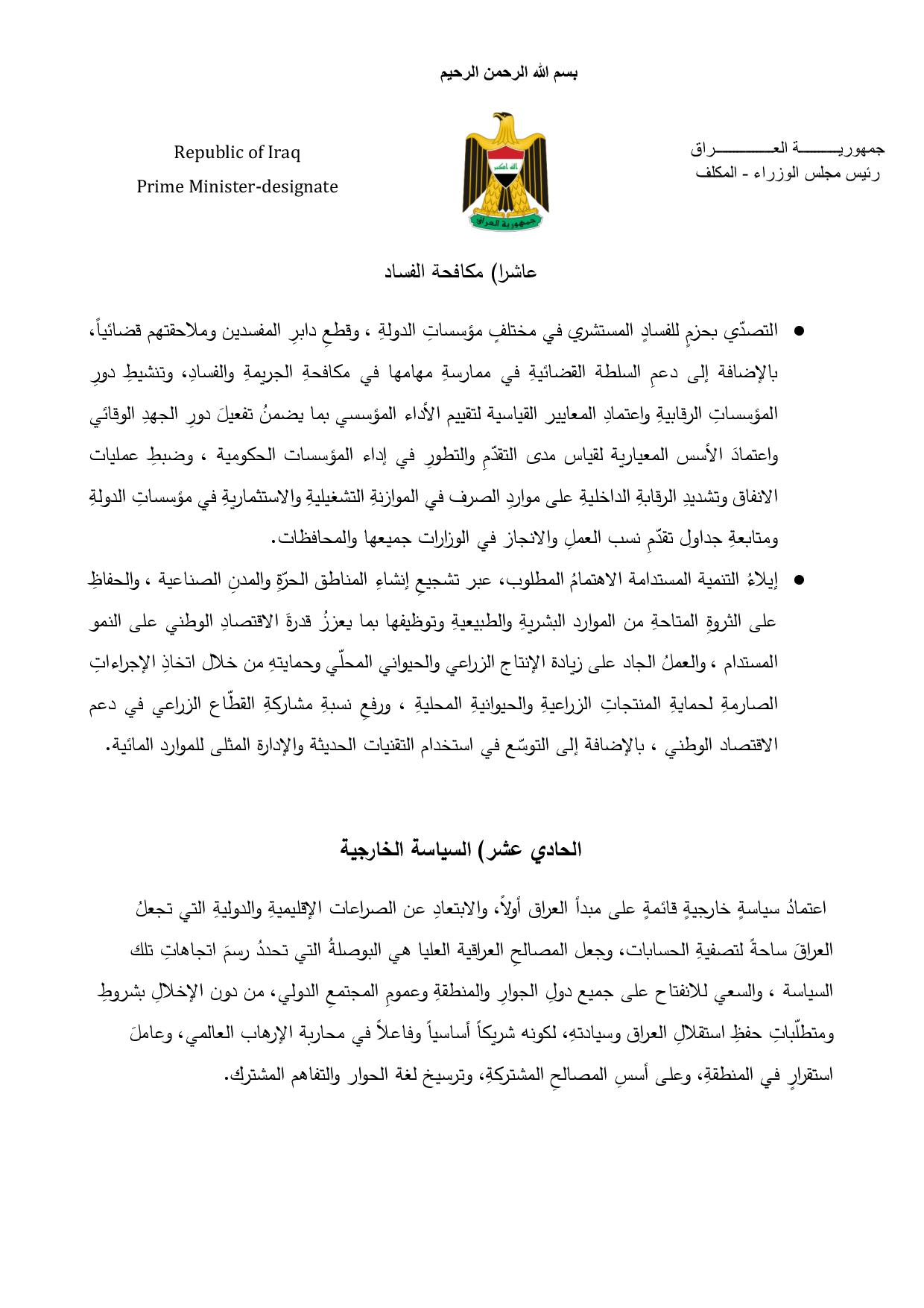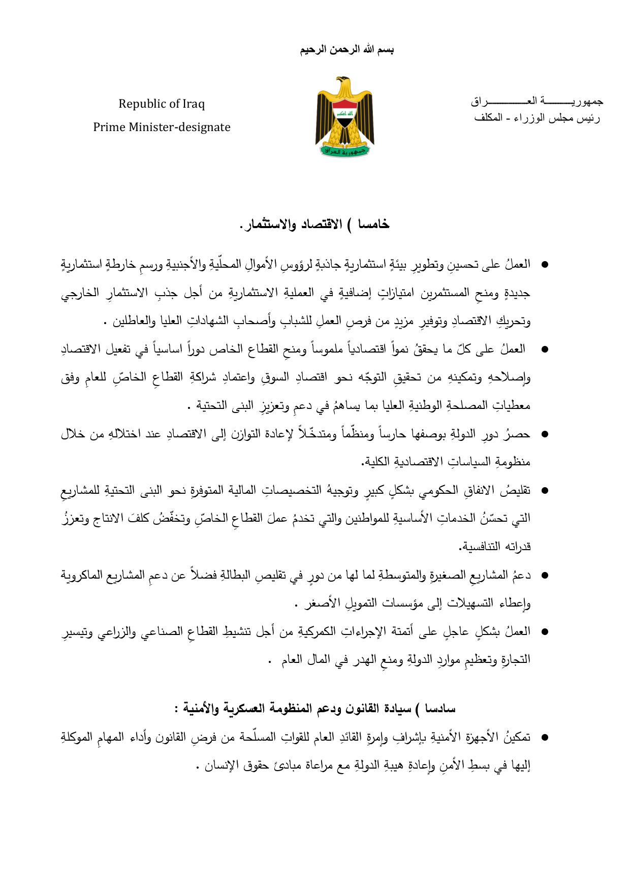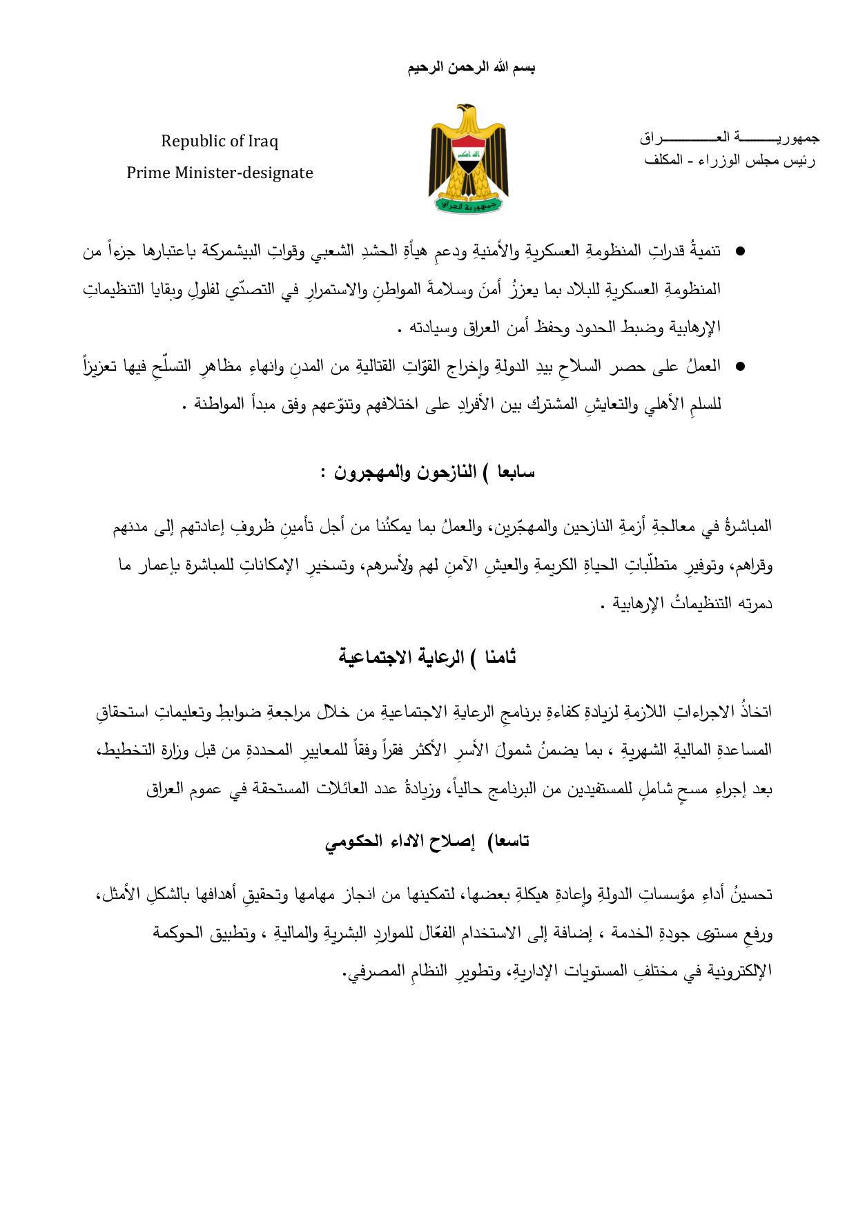 وتضمن البرنامج كذلك "تنمية قدرات المنظومة العسكرية والأمنية ودعم هيئة الحشد الشعبي وقوات البيشمركة باعتبارهما جزءاً من المنظومة العسكرية للبلاد".