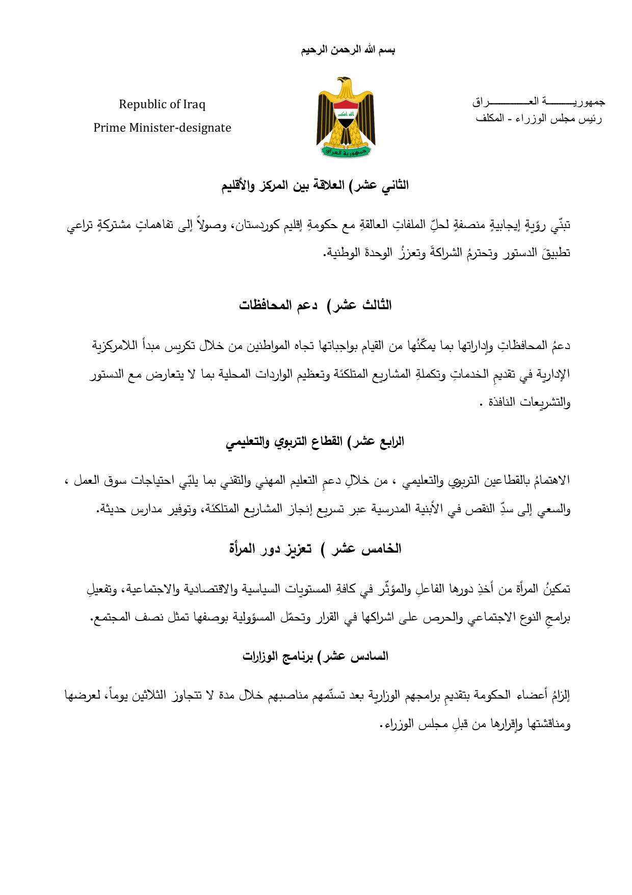 وتضمن المنهاج الوزاري جملة من القضايا ومنها تحديد العلاقة بين المركز وإقليم كوردستان وجاء فيها "تبني رؤية إيجابية منصفة لحل الملفات العالقة مع حكومة إقليم كوردستان، وصولاً إلى تفاهمات مشتركة تراعي تطبيق الدستور وتحترم الشراكة وتعزز الوحدة الوطنية".