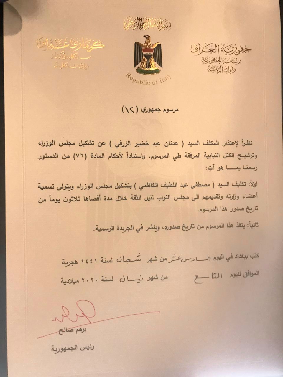 كلف الرئيس العراقي برهم صالح الخميس مدير جهاز المخابرات الوطني مصطفى الكاظمي بتشكيل الحكومة الجديدة بعد قليل من اعتذار المكلف عدنان الزرفي عن المهمة.