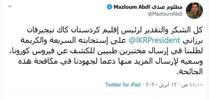 ونشر مظلوم عبدي على حسابه في موقع تويتر "كل الشكر والتقدير لرئيس إقليم كوردستان كاك نيجيرفان بارزاني على استجابته السريعة والكريمة لطلبنا في إرسال مختبرين طبيين للكشف عن فيروس كورونا، وسعيه لإرسال المزيد منها دعماً لجهودنا في مكافحة هذه الجائحة".
