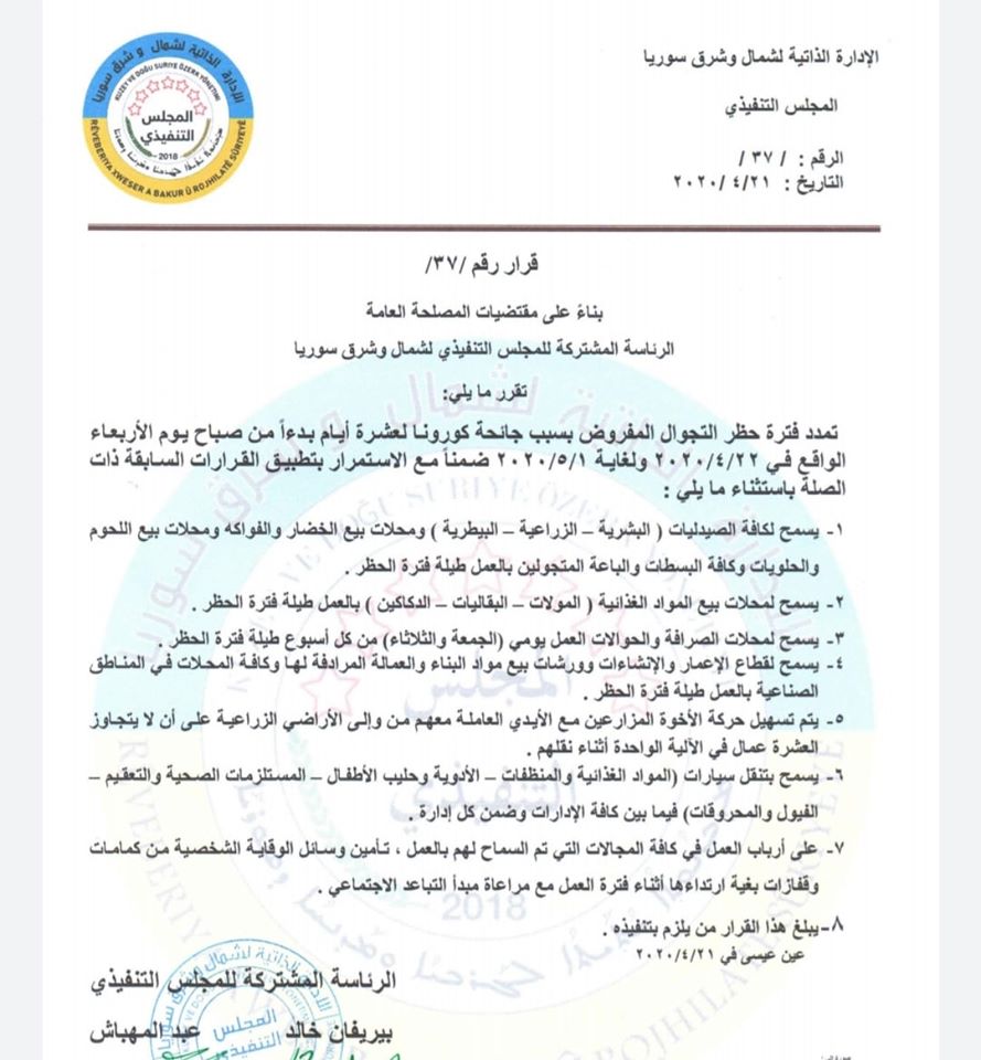 أربيل (كوردستان 24)- مددت الإدارة الذاتية لشمال شرق سوريا حظر التجوال المفروض منعا من تفشي جائحة كورونا، فيما خففت المزيد من القيود على المواطنين.