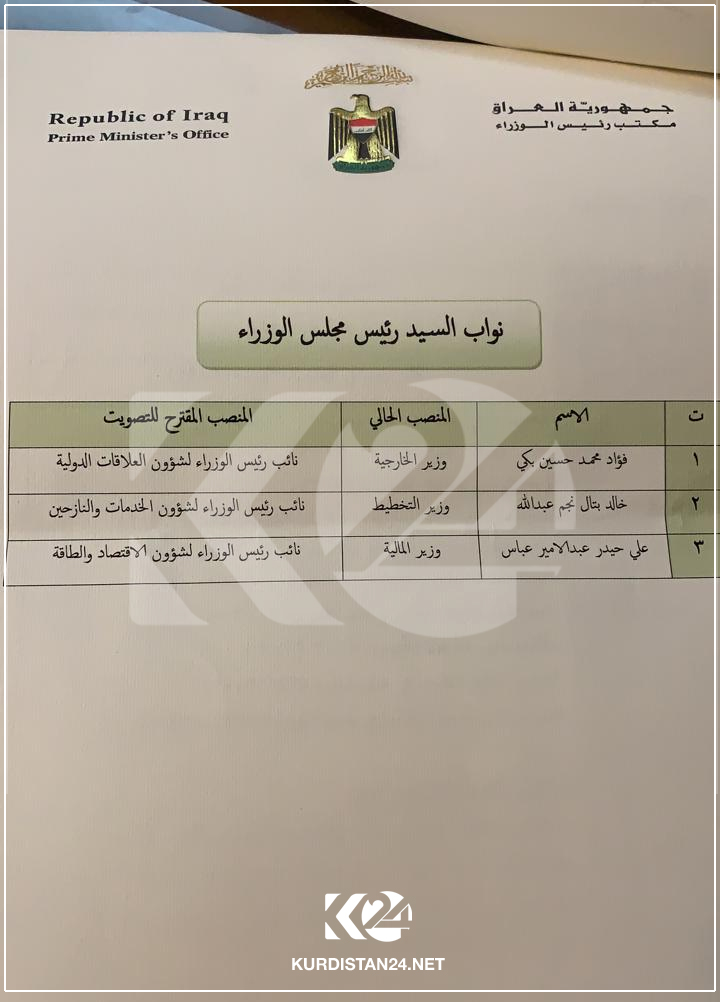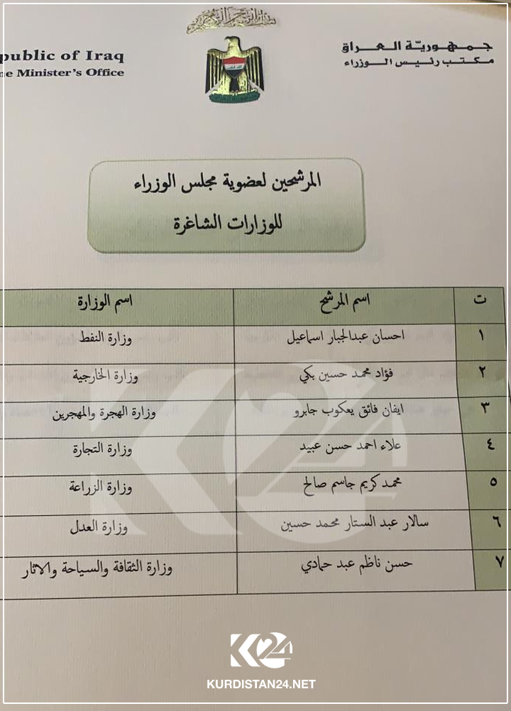 ورُشح حسن ناظم لوزارة الثقافة، وإحسان عبد الجبار للنفط، ومحمد عبد الكريم للزراعة، وعلاء الجبوري لوزارة التجارة.