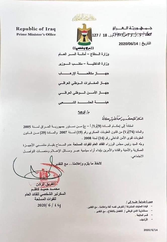وجاء في كتاب موقع بتاريخ أمس الأحد باسم السكرتير الشخصي للقائد العام للقوات المسلحة بأن الكاظمي "وجه عدم السماح بقيام منتسبي الأجهزة العسكرية والأمنية والقادة والآمرين بإبداء آراء سياسية عبر وسائل الإعلام ومنصات التواصل الاجتماعي".