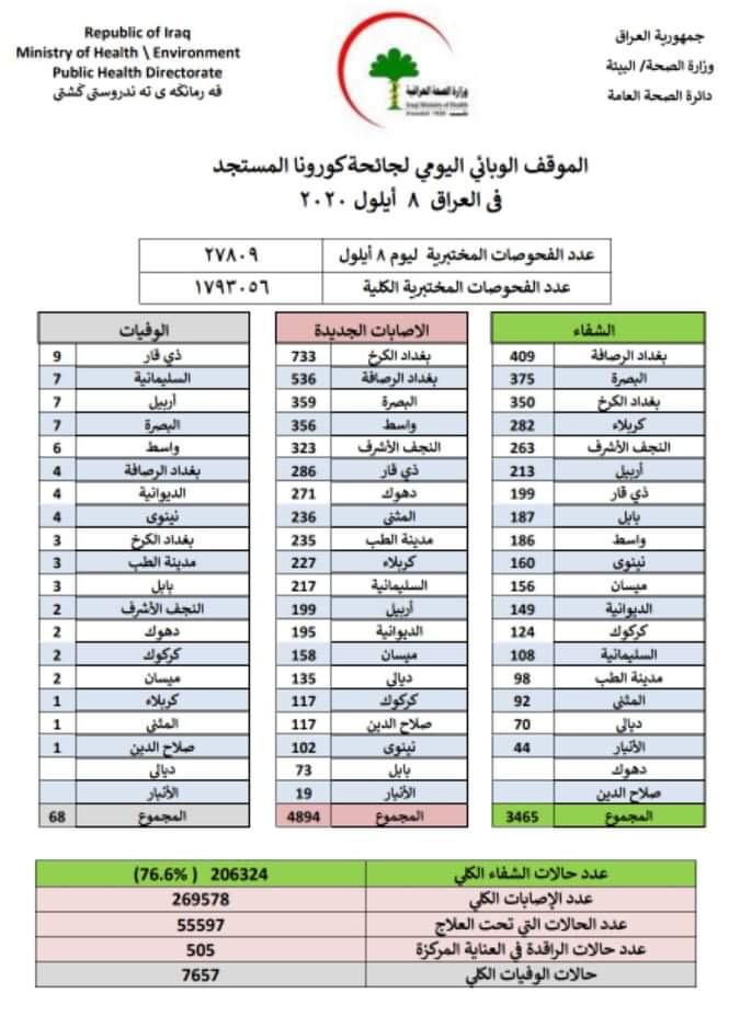 اعلنت وزارة الصحة والبيئة العراقية، اليوم الثلاثاء، تسجيل 68 وفاة و4894 اصابة جديدة بفيروس كورونا في عموم البلاد، خلال 24 ساعة.