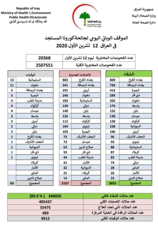 العراق يسجل 3107 اصابة جديدة بكورونا