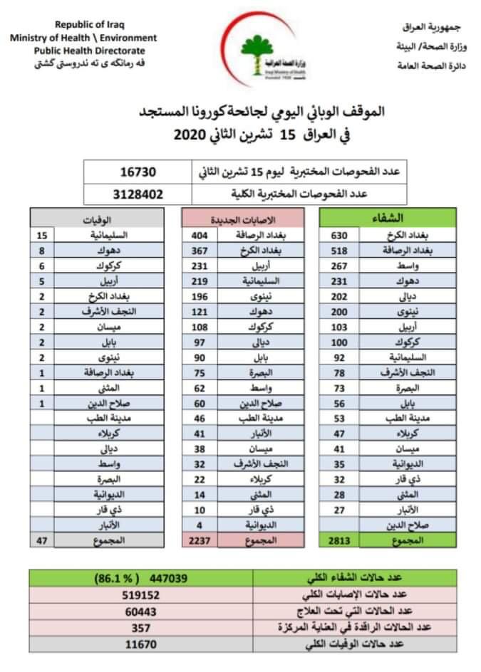 اعلنت وزارة الصحة والبيئة العراقية، يوم الأحد، تسجيل 47 وفاة و2237 اصابة جديدة بفيروس كورونا المستجد، خلال 24 ساعة الماضية.
