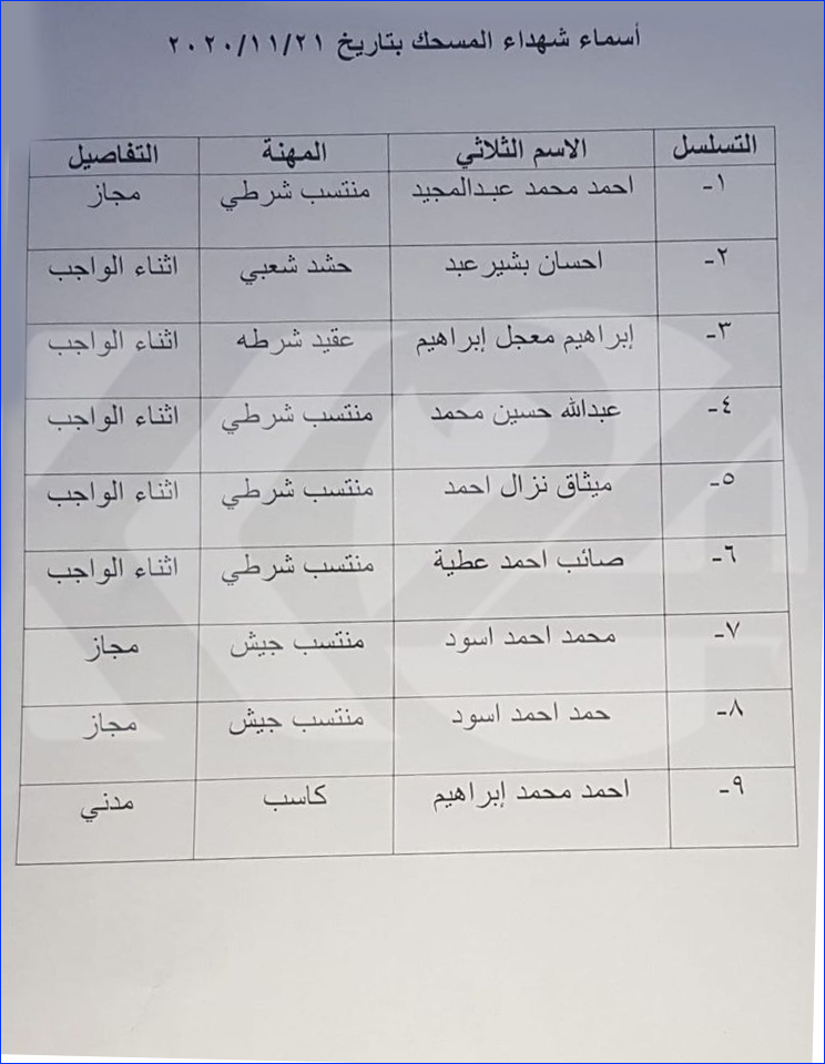 وأعلنت السلطات الرسمية أرقاماً مغايرة. وأطلعت كوردستان 24 على أسماء الضحايا ومعظمهم منتسبون في الأجهزة الأمنية باستثناء مدني واحد.