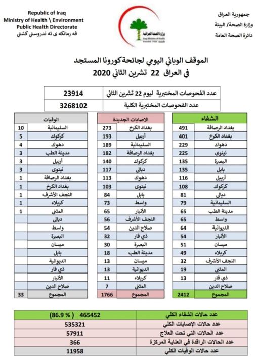 اعلنت وزارة الصحة والبيئة العراقية يوم الأحد، تسجيل 1766 اصابة جديدة بفيروس كورونا المستجد، خلال 24 ساعة الماضية.