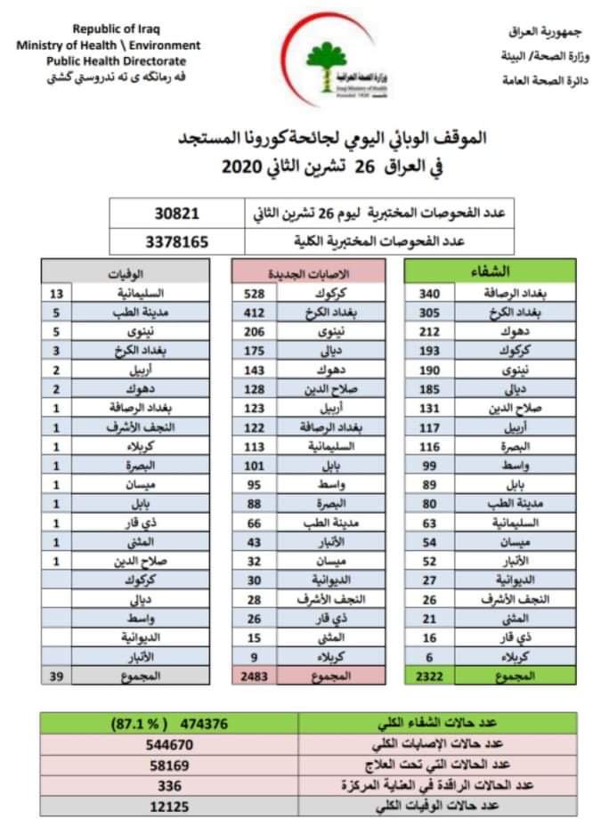 وبلغ اجمالي عدد الإصابات في العراق 544670 اصابة، شفي منها 474376 فيما توفي حتى الآن 12125 شخصا.