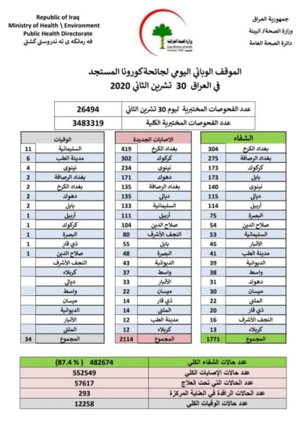 وذكر تقرير للوزارة انه تم تسجيل 1771 حالة شفاء في عموم مناطق البلاد ليصل العدد الكلي لحالات الشفاء الى 482674.