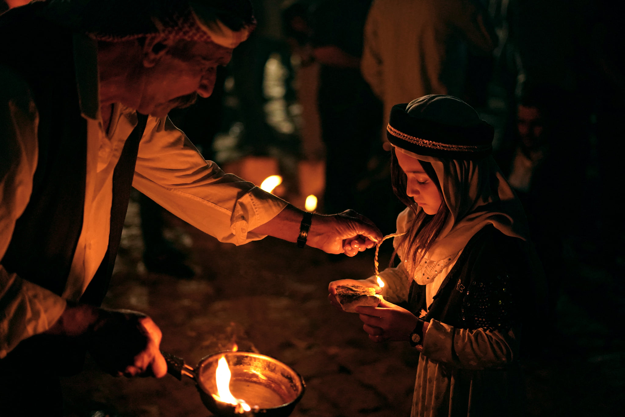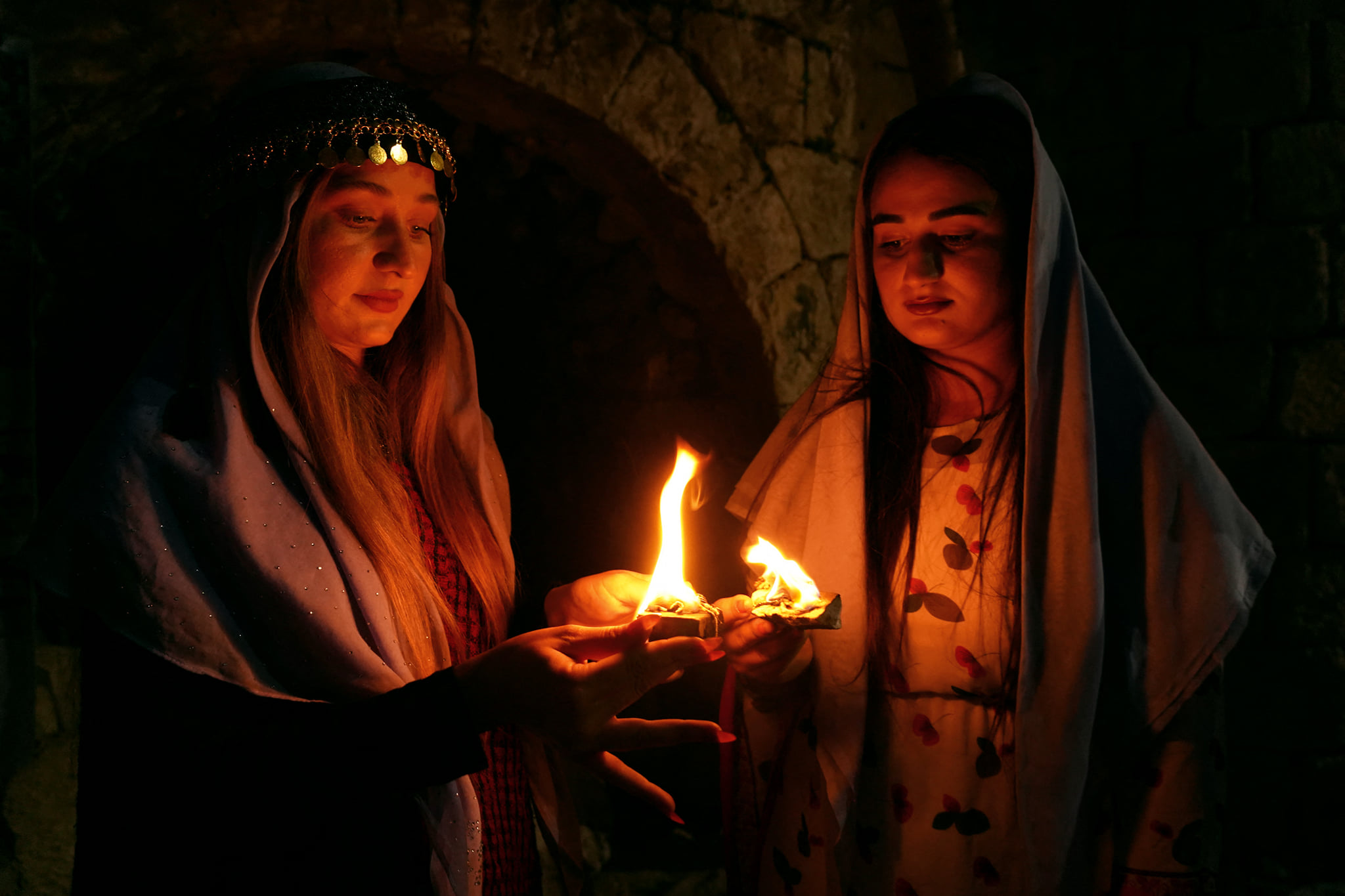 أربيل (كوردستان 24)- بلباس أبيض وشعلات نار، الإيزيديون يحتلفون ويضيئون الشموع بمناسبة رأس السنة الإيزيدية في معبد لالش بمحافظة دهوك.