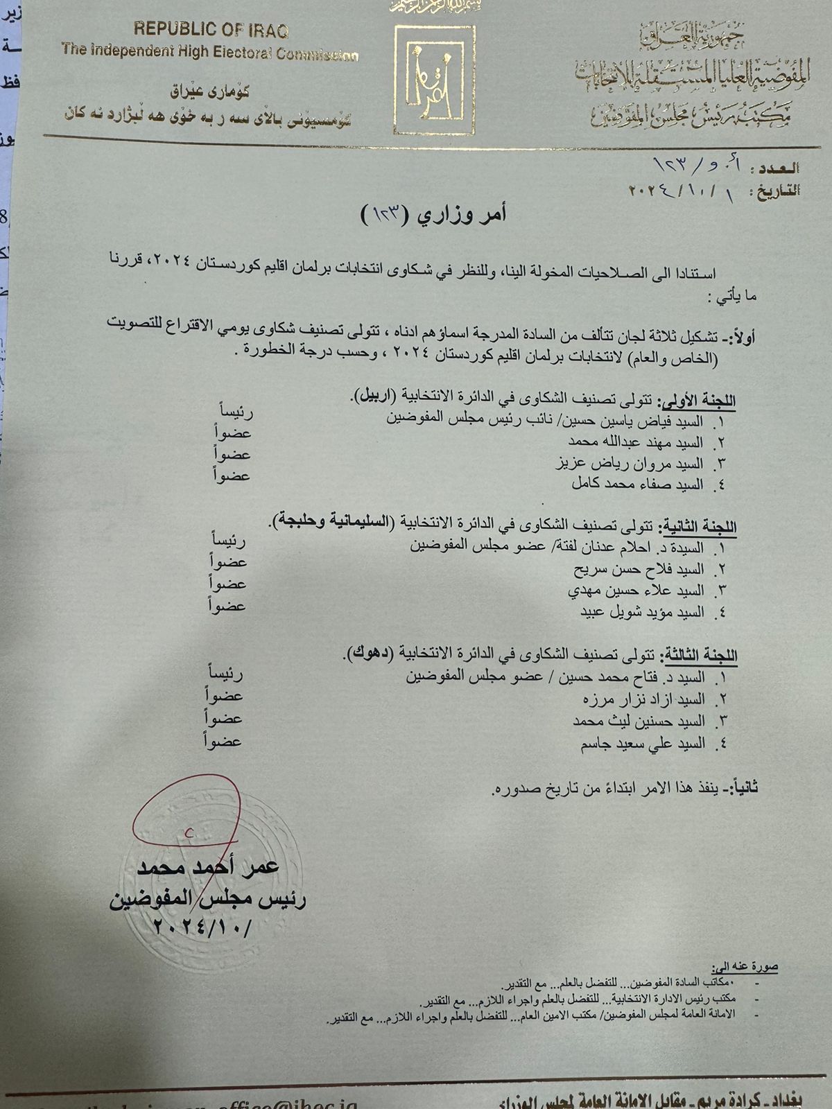 وبحسب بيانٍ أصدرته المفوضية، فإن اللجنة الأولى ستتولّى تصنيف الشكاوى في الدائرة الانتخابية (أربيل.