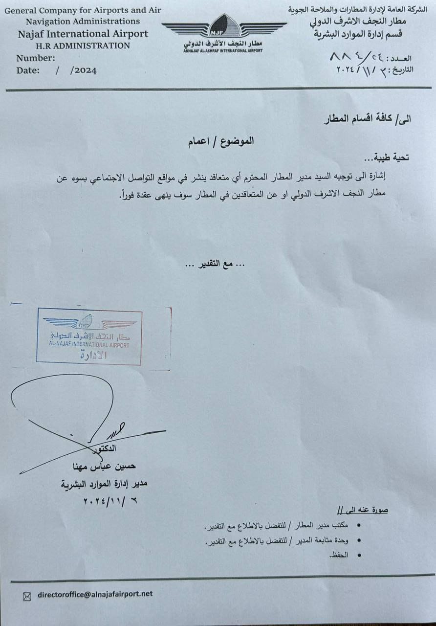 وأصدر مدير إدارة الموارد البشرية في المطار، حسين مهنا، تعميماً على كافة الموظفي المتعاقدين، أوضح فيه: إشارةً إلى توجيه مدير المطار، أي متعاقد ينشر في مواقع التواصل الاجتماعي بسوء عن مطار النجف أو عن المتعاقدين في المطار، سوف ينهي عقده فوراً.