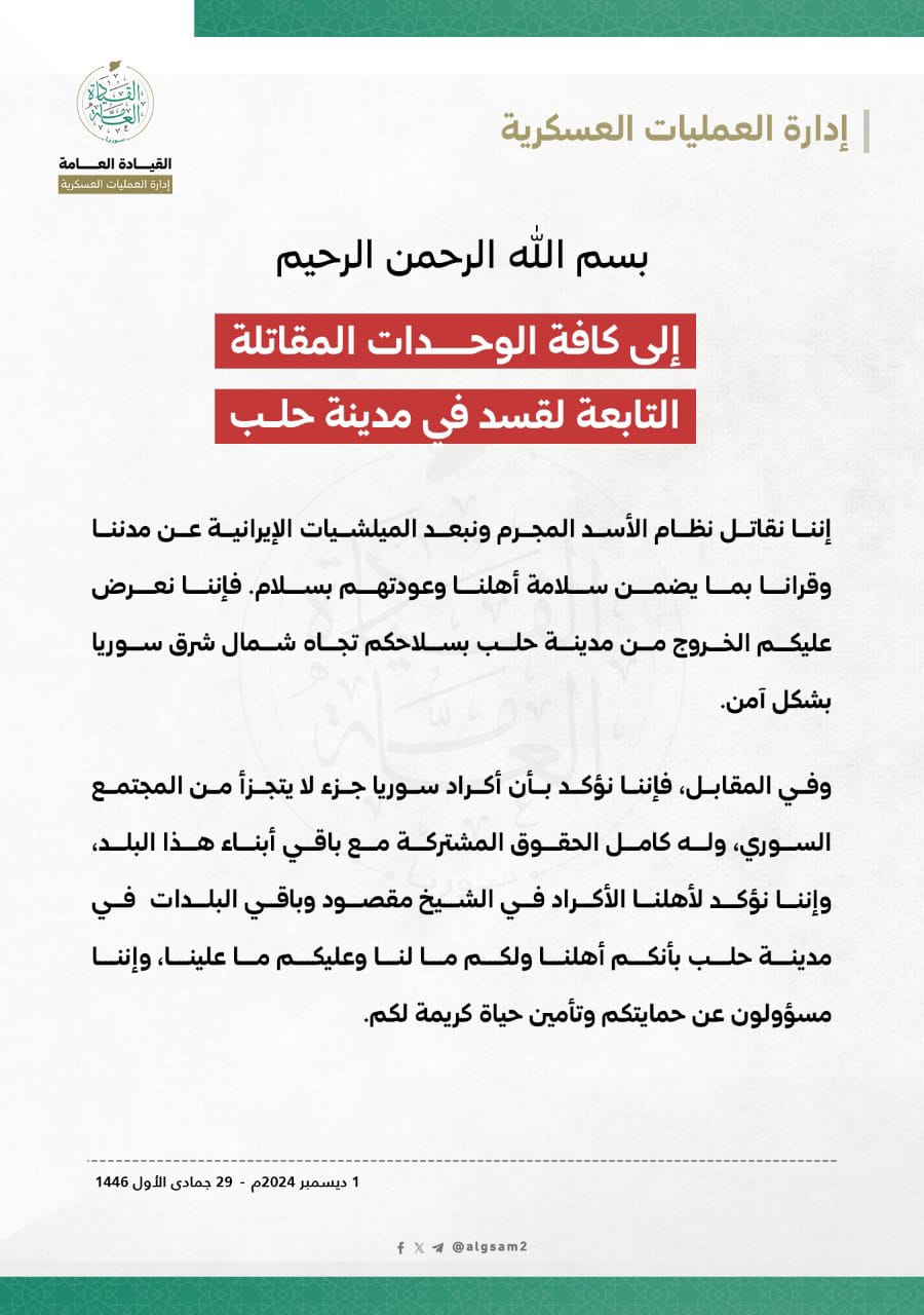 وأكدت المعارضة، في بيان لها، أن كورد سوريا جزء لا يتجزأ من المجتمع السوري، مشددة على التزامها بحماية المدنيين الكورد في أحياء الشيخ مقصود ومناطق أخرى في المدينة، وضمان حقوقهم وتأمين حياة كريمة لهم.
