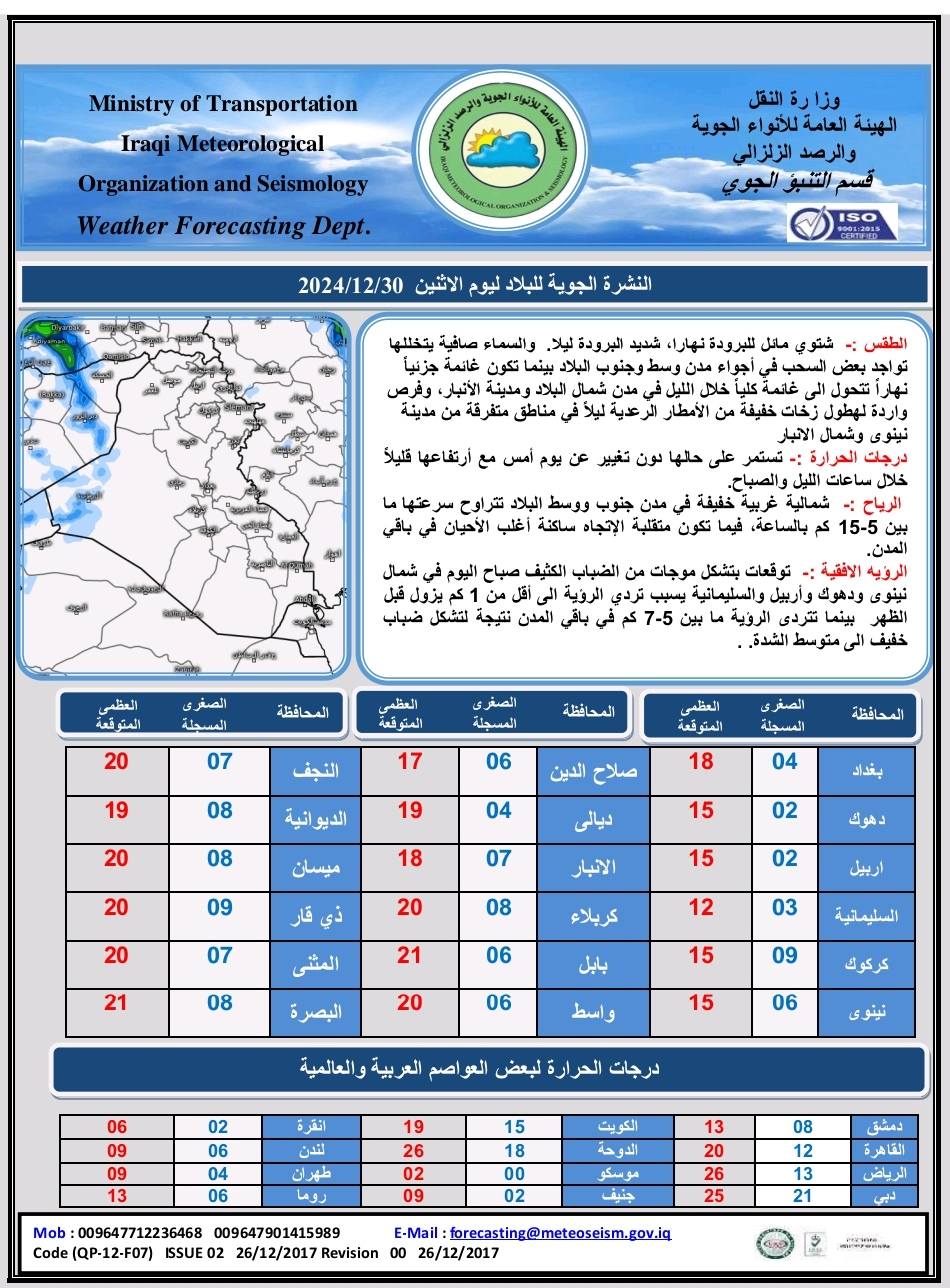 وتابع البيان، أن "درجات الحرارة الصغرى ستكون في دهوك واربيل والسليمانية 03، بغداد وصلاح الدين والانبار ونينوى وبابل وواسط06، اما البصرة والديوانية وذي قار07".