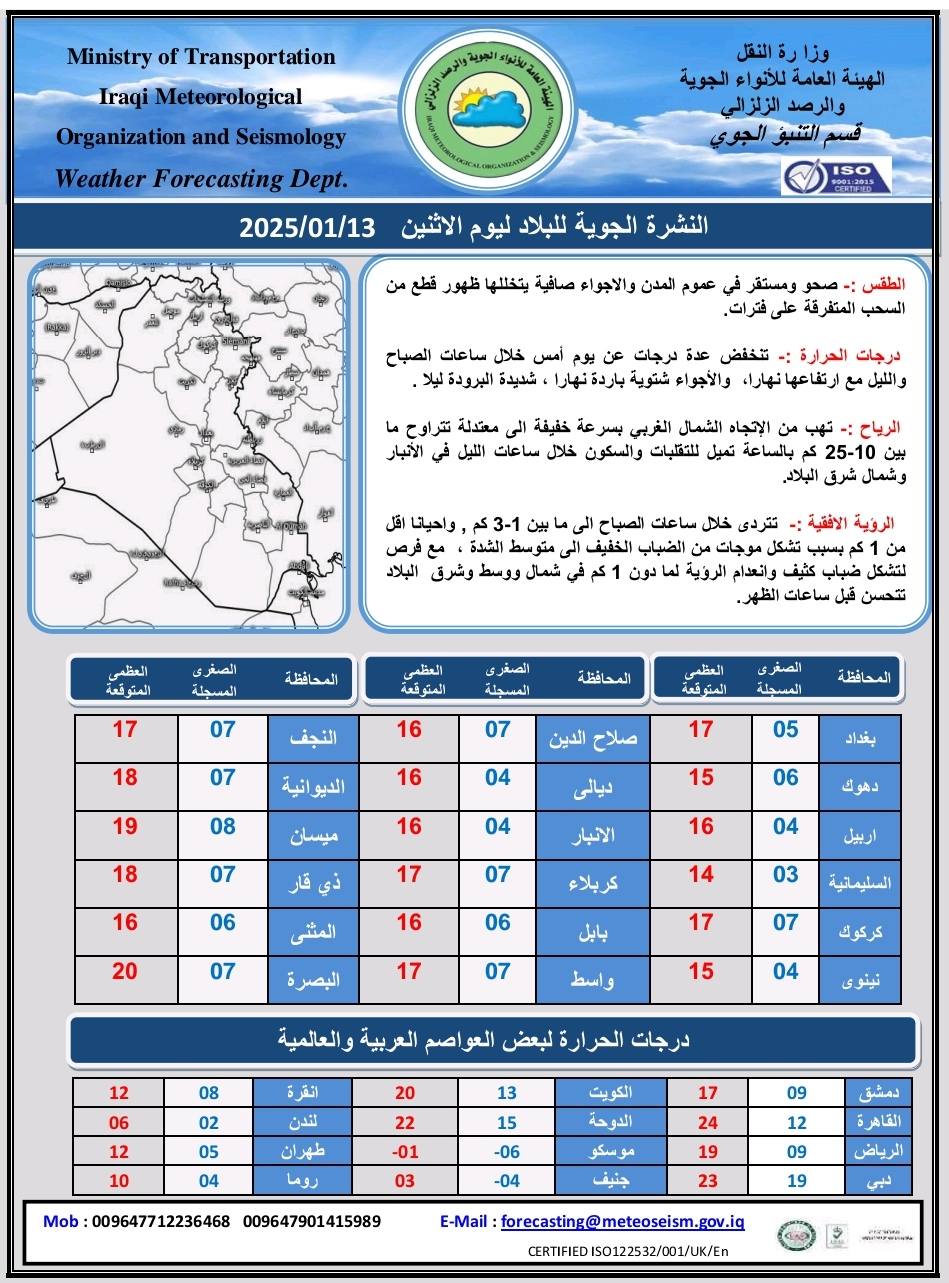 وذكر بيان للهيئة العامة للانواء الجوية والرصد الزلزالي قسم التنبؤ الجوي اليوم الاثنين 13 كانون الثاني 2025، أن "الطقس ليوم غد الثلاثاء سيكون صحواً مع بعض الغيوم في المنطقة الوسطى وغائماً جزئياً الى غائم في المنطقتين الشمالية والجنوبية، كما يتشكل الضباب صباحاً في عموم البلاد ويزول تدريجياً، ودرجات الحرارة ترتفع قليلاً عن اليوم السابق في عموم البلاد"، مبينا أن "درجات الحرارة العظمى ستكون في بغداد وكربلاء المقدسة وواسط والنجف الاشرف وكركوك 19، ديالى ولأنبار وصلاح الدين وأربيل 18،ميسان 21، وذي قار والديوانية 20 ، أما البصرة فستكون 22".