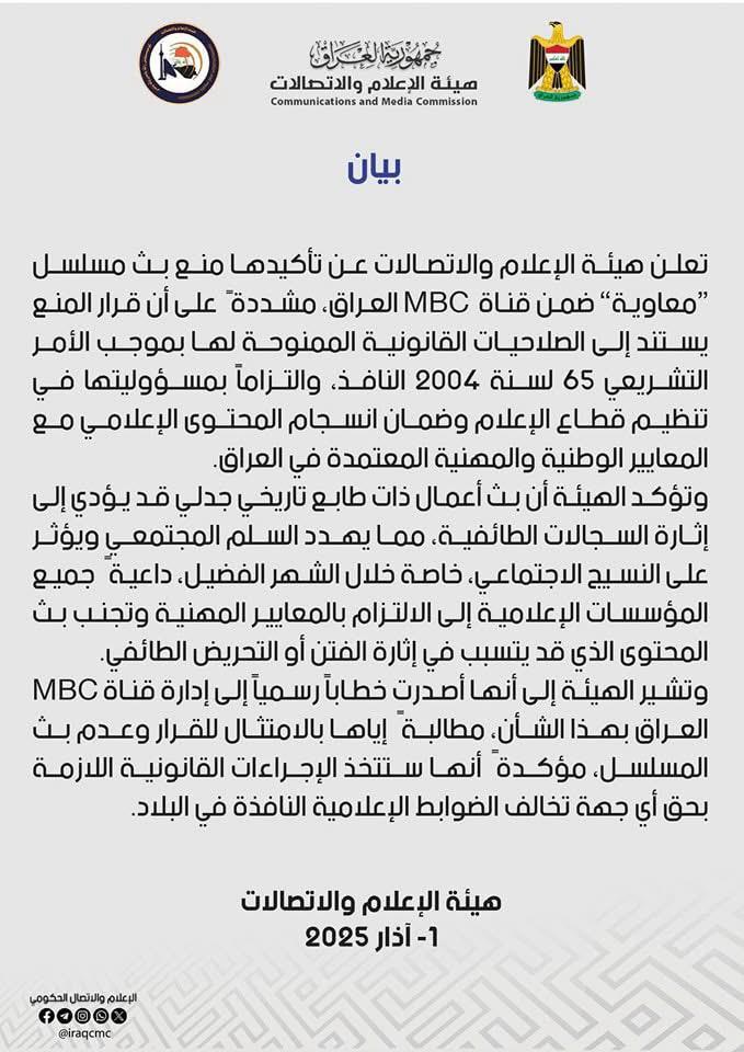 هيئة الإعلام والاتصالات العراقية تعلن عن منع بث مسلسل "معاوية" على قناة MBC العراق