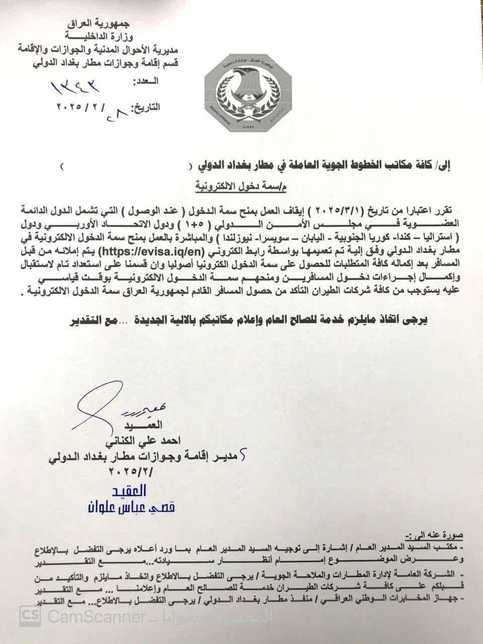 أربيل (كوردستان 24)- أعلنت مديرية الأحوال المدنية والجوازات والإقامة، التابعة لوزارة الداخلية العراقية، حسب وثيقة حصلت كوردستان24 على نسخة منها، إيقاف منح تأشيرة الدخول عند الوصول اعتباراً من 1 آذار/مارس 2025، وذلك للمسافرين من الدول الدائمة العضوية في مجلس الأمن الدولي، إضافة إلى دول الاتحاد الأوروبي وأستراليا وكندا وكوريا الجنوبية واليابان وسويسرا ونيوزيلندا.