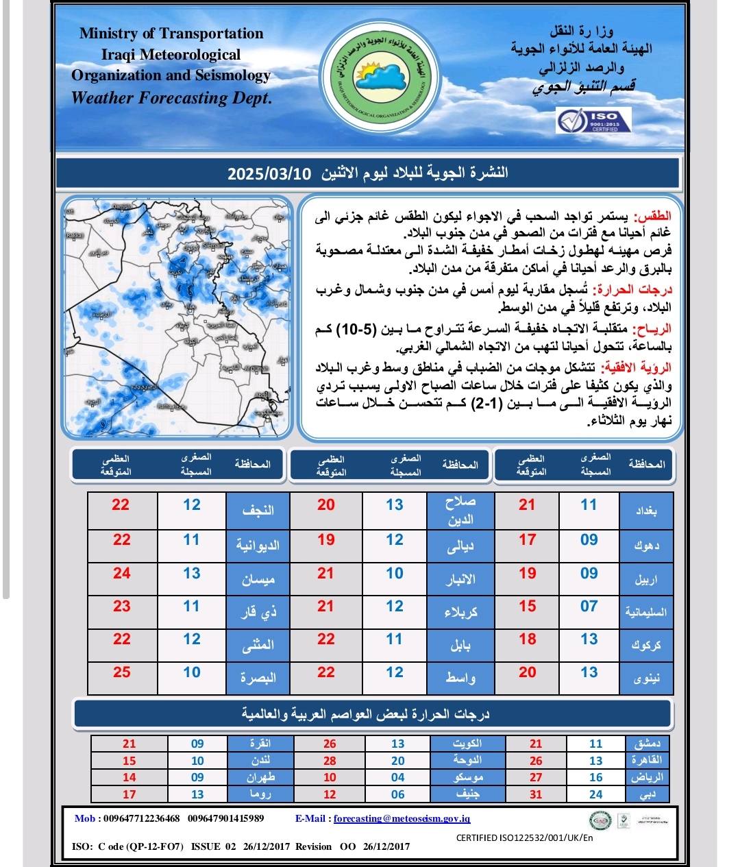 وذكر بيان للهيئة العامة للانواء الجوية والرصد الزلزالي قسم التنبؤ الجوي اليوم الاثنين 10 اذار 2025، أن "غداً الثلاثاء سيكون الطقس في المنطقتين الوسطى والجنوبية صحواً إلى غائم جزئي ويكون الطقس في الأقسام الشرقية من البلاد غانماً يتحسن تدريجياً، ويكون الطقس في المنطقة الشمالية غائماً مع زخات مطر خفيفة خاصة في اقسامها الشرقية ويتحسن تدريجياً، درجات الحرارة ترتفع قليلا في عموم البلاد، الرؤية الافقية (8-10) كم وفي المطر (75) كم".